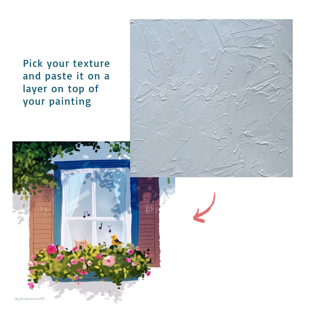 To use these textures, place them on a layer above your paint layer and set the layer style to overlay. You may need to adjust how light or dark the texture is to match your painting. Then adjust the opacity so it becomes more subtle.